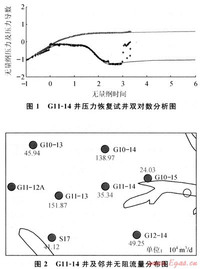 從儲(chǔ)層物性變化特征來看,可將氣藏分為均質(zhì)氣藏和復(fù)合氣藏兩類。G11-14井于1998年1月27日開始進(jìn)行壓力恢復(fù)試井,歷時(shí)27d(圖1),圖中實(shí)測(cè)數(shù)據(jù)的導(dǎo)數(shù)曲線在后期下掉之后又變平,反映了復(fù)合氣藏外區(qū)的徑向流特征,說明外區(qū)物性變好。盡管后期曲線中存在急劇上翹的數(shù)據(jù),但這種劇烈程度看來不應(yīng)是地層的不穩(wěn)定滲流結(jié)果,而可能為壓力計(jì)或其他因素引起的。試井解釋內(nèi)外區(qū)滲透率分別為7.1×10-3μm2和36.2×10-3μm2,外區(qū)明顯變好,從生產(chǎn)動(dòng)態(tài)數(shù)據(jù)上也得到驗(yàn)證(圖2)。