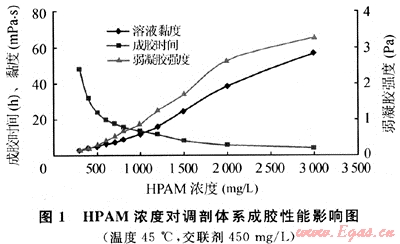 由圖1可見,聚合物濃度增加,體系成膠時(shí)間縮短。同時(shí)形成的弱凝膠強(qiáng)度隨著HPAM濃度的增加而增強(qiáng)。但當(dāng)HPAM濃度大于2000mg/L時(shí),雖然凝膠強(qiáng)度增加到1Pa以上(按凝膠強(qiáng)弱分級(jí)為較強(qiáng)凝膠),但成膠時(shí)間縮短到10h以下,這在大劑量深部處理時(shí)易導(dǎo)致前期調(diào)剖劑段塞反應(yīng)太快而使后面的調(diào)剖劑注入困難。此外,HPAM濃度越高,調(diào)剖體系溶液越黏稠,配制及注入都相對要困難些。在弱凝膠強(qiáng)度及性能滿足作業(yè)要求條件下,低濃度可獲得較低的成本。但濃度不能低于400mg/L,因?yàn)镠PAM濃度在400mg/L以下時(shí)弱凝膠強(qiáng)度很弱,穩(wěn)定1~2周后有少量的游離水,但弱凝膠HPAM濃度在500mg/L以上時(shí),形成的弱凝膠性能則穩(wěn)定。