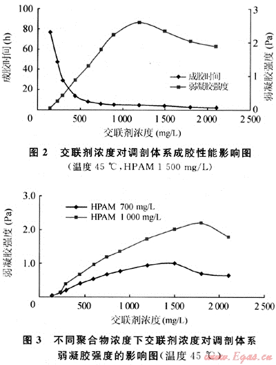 由圖2、圖3可見,聚合物濃度一定時(shí),交聯(lián)劑濃度增加,體系成膠時(shí)間縮短,形成的弱凝膠強(qiáng)度增加,這是因?yàn)榻宦?lián)劑濃度增加,聚合物交聯(lián)機(jī)會(huì)及弱凝膠分子間交聯(lián)密度增加所致。但交聯(lián)劑濃度過高時(shí),體系形成的弱凝膠反而有所降低,長期放置觀測發(fā)現(xiàn)弱凝膠不穩(wěn)定,有輕微脫水現(xiàn)象。這是因?yàn)榻宦?lián)劑濃度過高,體系反應(yīng)形成凝膠后,溶液內(nèi)部的活性基團(tuán)與交聯(lián)劑之間的化學(xué)反應(yīng)仍在進(jìn)行,這會(huì)使凝膠的交聯(lián)點(diǎn)增加,交聯(lián)密度增大導(dǎo)致凝膠的分子線團(tuán)發(fā)生收縮,從而出現(xiàn)脫水和破膠現(xiàn)象。同時(shí)交聯(lián)劑濃度太小時(shí),體系交聯(lián)不充分或不能有效地進(jìn)行交聯(lián),形成的凝膠太弱或不能形成整體凝膠,用于調(diào)剖難以形成有效的堵塞。此外聚合物濃度越高,形成穩(wěn)定弱凝膠要求的交聯(lián)劑也相應(yīng)增加。用于裂縫凝析氣藏調(diào)剖作業(yè)的弱凝膠,一般要求弱凝膠強(qiáng)度稍高,在1Pa以上。HPAM在1000mg/L以上,調(diào)剖劑最佳交聯(lián)劑濃度確定在450~900mg/L,該調(diào)剖體系形成的弱凝膠穩(wěn)定,弱凝膠在地層中可移動(dòng),從而達(dá)到調(diào)剖目的。