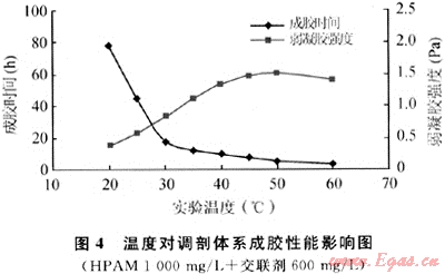 溫度是交聯(lián)化學(xué)反應(yīng)最敏感因素之一,尤其是對成膠時(shí)間的影響。在HPAM YG103弱凝膠交聯(lián)反應(yīng)中,過高的溫度會(huì)使弱凝膠破膠水化,筆者考察了30~50℃條件下調(diào)剖劑體系成膠性能的影響。實(shí)驗(yàn)中固定交聯(lián)體系配方,將體系溶液分別置于不同溫度的水浴中,定期觀測交聯(lián)體系的成膠時(shí)間及形成弱凝膠的強(qiáng)度。實(shí)驗(yàn)結(jié)果見圖4。