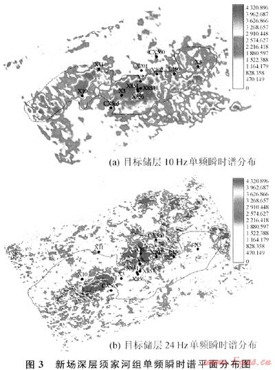 圖3所示是新場地區(qū)深層須家河組單頻瞬時譜平面分布情況,其顯示的瞬時譜具有十分明顯的差異。在圖3-a中,低頻強瞬時譜區(qū)域(紅色)包括了所有天然氣高產(chǎn)工業(yè)井,低產(chǎn)井分布在低頻弱瞬時譜區(qū)域(淺藍色),水井分布區(qū)域低頻瞬時譜更弱(白色)。在圖3-b中的多邊形框內(nèi),高頻強瞬時譜是泥巖響應(yīng),而高頻弱瞬時譜是有效砂巖儲層響應(yīng)。雖然,含氣儲層和含水儲層在高頻段有相似的響應(yīng)特征,但是,結(jié)合已知井信息,將圖3-a與圖3-b進行仔細對比,就可以發(fā)現(xiàn)含氣儲層和含水儲層具有不同的時頻響應(yīng)規(guī)律。