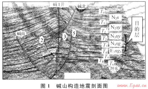 堿山構(gòu)造新近系自晚燕山運(yùn)動(dòng)以來,先后經(jīng)歷了多次喜山運(yùn)動(dòng)[7]。強(qiáng)烈的擠壓構(gòu)造運(yùn)動(dòng),一方面在本區(qū)形成了背斜構(gòu)造,為天然氣的聚集提供了可能的場(chǎng)所,但另一方面構(gòu)造運(yùn)動(dòng)形成的斷裂,會(huì)破壞構(gòu)造的完整性,將構(gòu)造分割成不同的斷塊,不利于天然氣的聚集,其中堿北斷裂斷至地表,對(duì)成藏極為不利。堿山構(gòu)造淺層與深層以T3為界分成兩部分,深層構(gòu)造受早期高角度逆沖斷層控制,在剖面上表現(xiàn)為兩斷夾一隆基底卷入型構(gòu)造樣式;淺層構(gòu)造受淺層滑脫斷層即堿北斷層控制,形成蓋層滑脫型構(gòu)造樣式(圖1)。