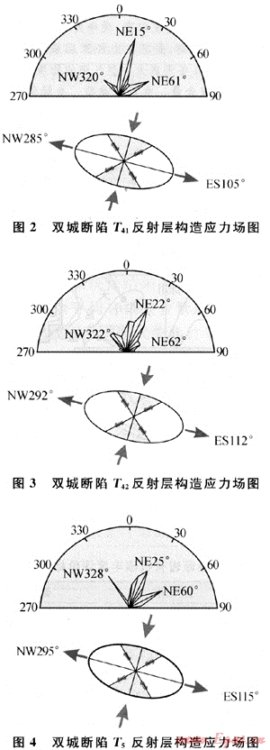 通過上述方法的研究分析后認為:①雙城斷陷伸展時期原始邊界主斷層走向為NNE15°~25°;②兩個共軛張扭斷層(走滑斷層)方向分別為NEE60°~62°和NW320°~328°;③雙城斷陷火石嶺組營城組火山巖段沉積時期構(gòu)造應(yīng)力場為主張應(yīng)力,方向為NW(285°~295°)-SE(105°~115°),主壓應(yīng)力方向:NE(15°~25°)-SW(185°~205°)。