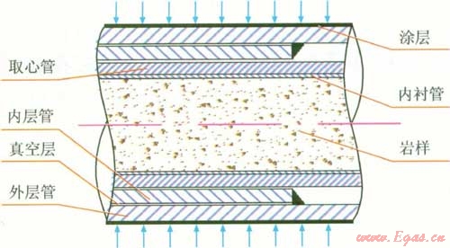 系統(tǒng)保溫筒設(shè)計(jì)如圖2,采用超高真空絕熱方式,在內(nèi)層管、外層管間抽真空;高真空層內(nèi)外表面噴涂等離子隔熱材料;外層管表面涂防陽光輻射涂料;在取心筒外面直接用保溫材料實(shí)施保溫。保溫結(jié)構(gòu)設(shè)計(jì)簡(jiǎn)單,現(xiàn)場(chǎng)可操作性強(qiáng),使用方便。