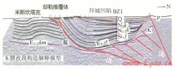 在鹽的滑脫作用下,鹽上層變形與鹽下層變形不協(xié)調(diào)。鹽上層主要表現(xiàn)為幅度很小的向斜盆地和推覆距離很大的逆沖推覆體,鹽下前緣斷層在擠壓作用下即開始形成,直至擠壓最終結(jié)束,始終在活動(dòng)。而鹽上負(fù)載則在鹽的滑脫作用下推覆至鹽盆地南邊的硬性地層之上,并由于鹽的聚集作用和基底的抬升作用,鹽上