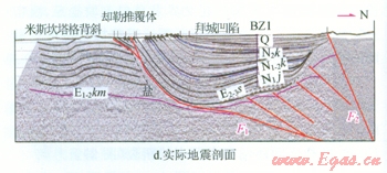 圖4-c、d、f為物理模擬實(shí)驗(yàn)的解釋方案與實(shí)際地震資料解釋方案的對(duì)比,顯然只有早期存在鹽底辟的模擬實(shí)驗(yàn)結(jié)果與地震剖面吻合,早期不存在鹽底辟的