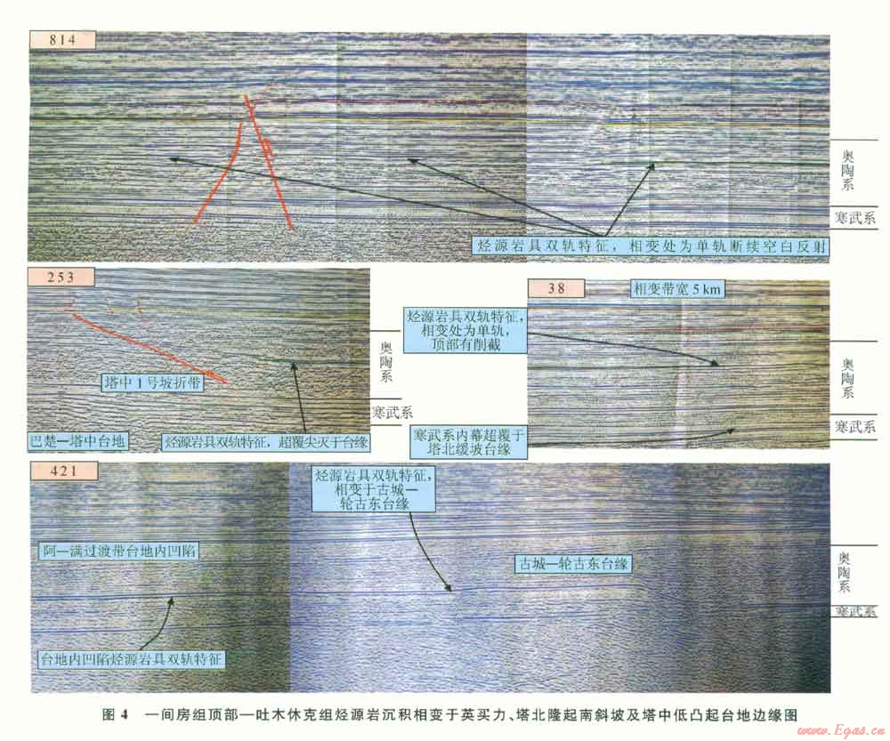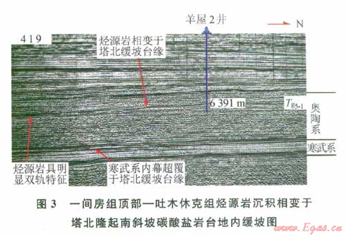 但是,通過對經(jīng)過羊屋2井地震剖面(測線419)的精細(xì)分析(圖3),發(fā)現(xiàn)在羊屋2井南部3 km處存在同相軸Tg5-1及其下面的“雙軌”變“單軌”的巖性相變反射,即代表著上奧陶統(tǒng)良里塔格組石灰?guī)r頂面Tg5-1之下的強(qiáng)反射軸發(fā)生相變。同時經(jīng)多條地震剖面相互閉合、連接確認(rèn),此發(fā)生相變的“雙軌”同相軸與過塔中29井烴源巖發(fā)育位置的強(qiáng)相位反射顯示的是同一套地層發(fā)射。據(jù)此認(rèn)為,中上奧陶統(tǒng)一間房組頂部—吐木休克組烴源巖沉積相變于塔北隆起南斜坡羊屋2井南3 km處的碳酸鹽巖臺地內(nèi)緩坡。