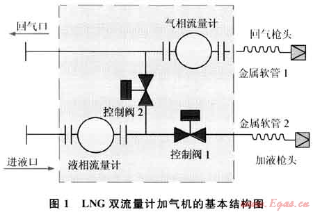 LNG為超低溫液體,其溫度一般在-140℃以下,且極易氣化,在加注過程中部分液體不斷氣化,這對(duì)貿(mào)易交接中LNG的準(zhǔn)確計(jì)量和將LNG順利加注到儲(chǔ)氣罐中提出了極大的挑戰(zhàn)。LNG加氣機(jī)一般分為雙流量計(jì)(包括液相和氣相流量計(jì))系統(tǒng)和單流量計(jì)(無氣相流量計(jì))系統(tǒng)。目前,主流的LNG加氣機(jī)采用雙流量計(jì),典型的LNG雙流量計(jì)加氣機(jī)的基本結(jié)構(gòu)如圖1所示,主要由加液通路、回氣通路和控制閥組成。