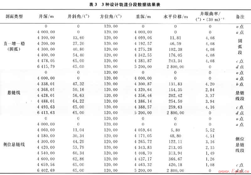 從表3可知,在設計井相同條件下,3種不同軌道具有幾何形狀特點如下:①設計井深以圓弧線最長(6415.79m、65.00°),懸鏈線次之(6413.63m、65.00°),側位懸鏈線最短(6402.69m、65.00°),最大相差13m左右;②增斜段長以側位懸鏈線最長(659.56m、10.30%),懸鏈線次之(493.63m、7.70%),圓弧線最短(478.05m,7.45%);③最大井眼曲率以側位懸鏈線最大(5.52°/30m),懸鏈線次之(4.20°/30m),圓弧線最小(4.08°/30m)。