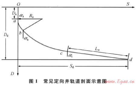 設計井眼軌道通常由4部分組成:oa段——直井段,ab——圓弧過渡段,bc段——特殊曲線井段(圓弧、懸鏈線或擬懸鏈線等),cd段——穩(wěn)斜井段(如圖1所示)。主要參數(shù)有:①靶點垂深Dd,水平位移Sd;②oa段:造斜點垂深Da,井斜角αa;③ab段:造斜率Ka或曲率半徑Ra;④cd段:穩(wěn)斜角αc、穩(wěn)斜段長度Lw等[3]。