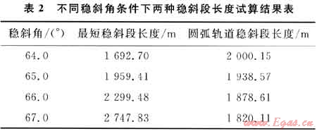 通過簡化式可試算出最大穩(wěn)斜角,即假設一個穩(wěn)斜角αc,對應算出一個穩(wěn)斜段長度Lw,然后與設計井在該穩(wěn)斜角下確定的圓弧軌道穩(wěn)斜段對比結果見表2,確定出最大穩(wěn)斜角αcmax=65.00°。
