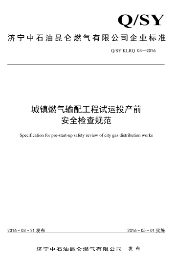 城鎮(zhèn)燃?xì)廨斉涔こ淘囘\(yùn)投產(chǎn)前安全檢查規(guī)范 Q/石油天然氣標(biāo)準(zhǔn) KLRQ04-2016