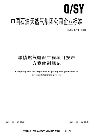 城鎮(zhèn)燃?xì)廨斉涔こ添?xiàng)目投產(chǎn)方案編制規(guī)范QSY 1478-2012本標(biāo)準(zhǔn)規(guī)定了城鎮(zhèn)燃?xì)廨斉涔こ?從門站至用戶引入管)項(xiàng)目投產(chǎn)試運(yùn)行方案的編制結(jié)構(gòu)和內(nèi)容。