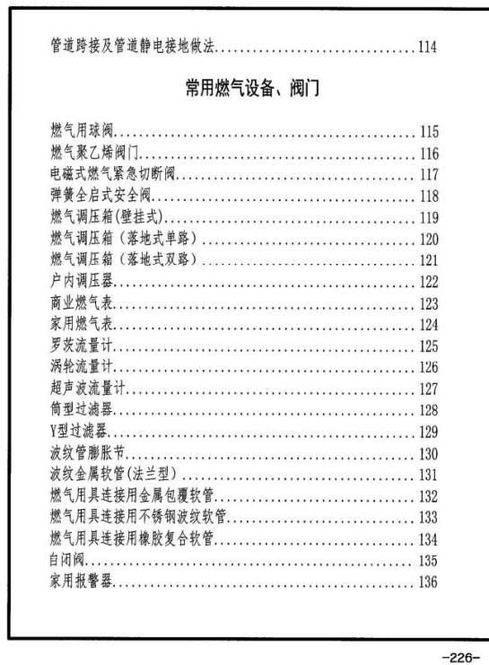 3.10本圖集“常用燃氣設備、閥門”列示了常用閥門、調壓箱、計量表等,根據最新國家規(guī)范的要求,增加了燃氣用具連接用不銹鋼波紋管、燃氣輸送用不銹鋼波紋管,自閉閥等國家規(guī)范要求或推薦使用的材料。由于市場上燃具和用氣設備種類繁多、更新換代較快,故取消了原燃具和用氣設備圖示。