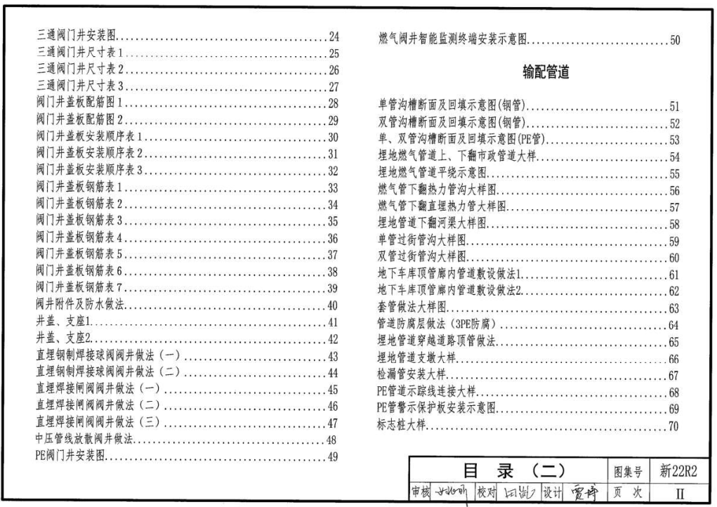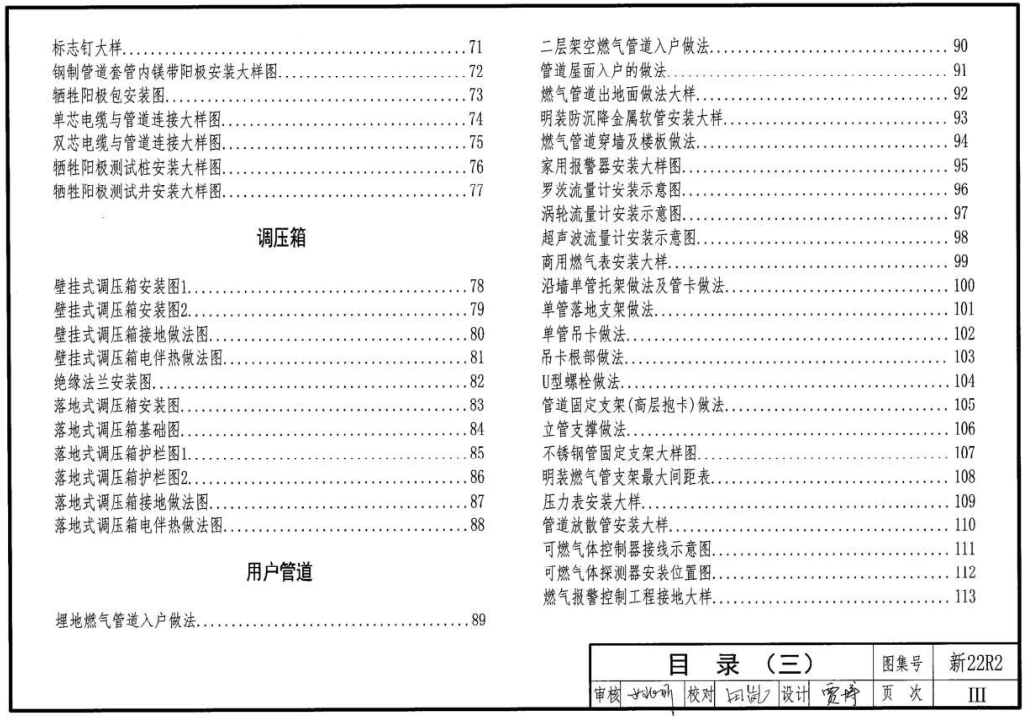 3.1本圖集在原12R301的基礎上進行了修訂,共分成6個章節(jié):設計示例;閥井安裝;輸配管道;調壓箱;用戶管道;常用燃氣設備、閥門。